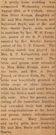 On August 26, 1914, Ethel married Raymond (W.R.) Boyle (10/10/1881 – 7/1964) and they moved to Sparta, Illinois.