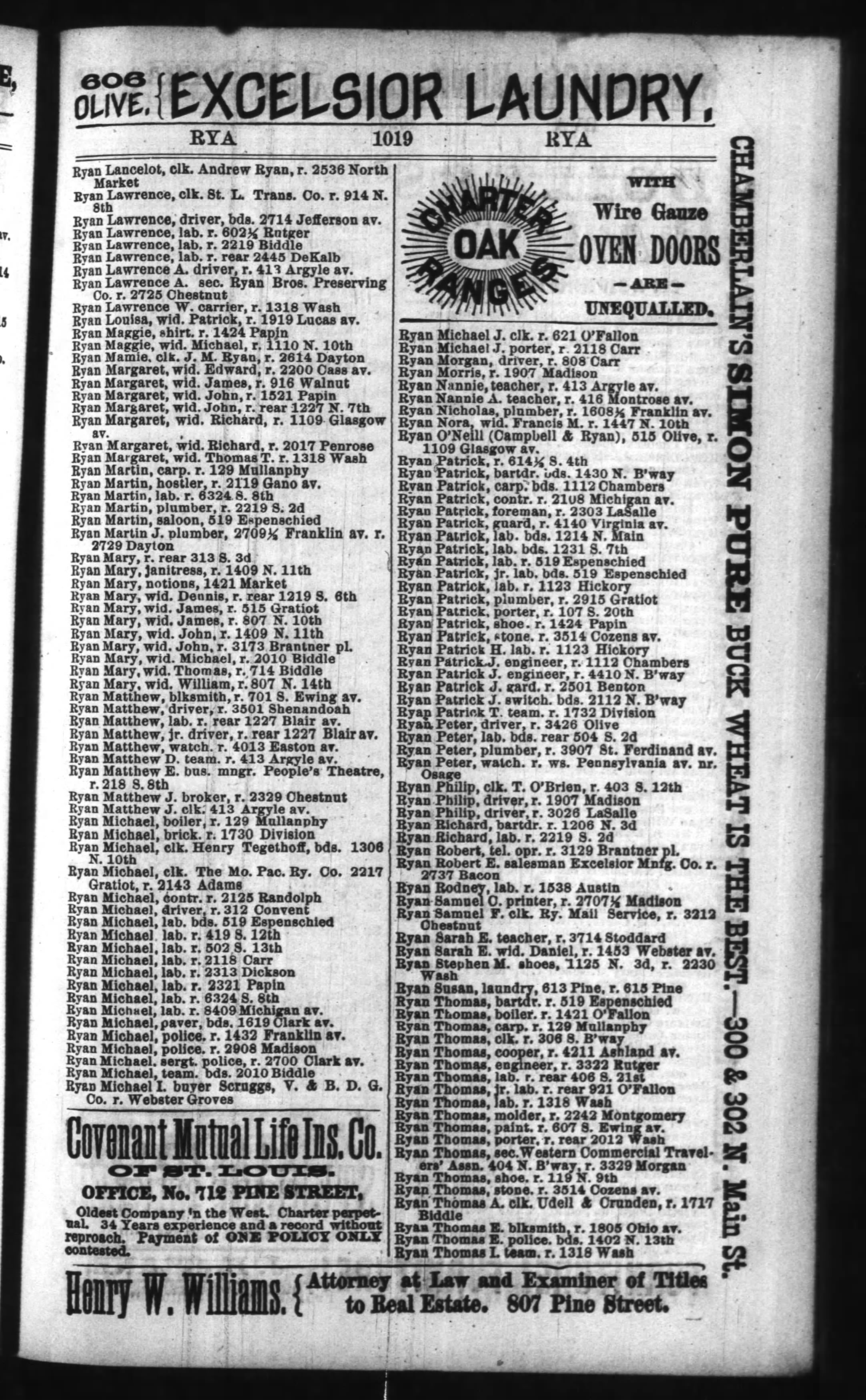 The 1880 Census, first enumeration, shows Julia living with her parents and three brothers: Albert Miller, Thomas P. Ryan and John W. Ryan. They were living at 2018 Orange Alley (between Lucas Avenue and Morgan) in St. Louis, Missouri. (2018 Orange Alley is the same as rear 2019 Lucas Avenue). Her father was a conductor on the horse drawn street cars.