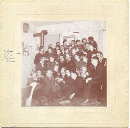 The back of the picture reads “To Julia from Luther March 28, 1899.” One man holds a pointer and is presumable a teacher or the leader of the group; however, the purpose or affiliation of the group is unknown.