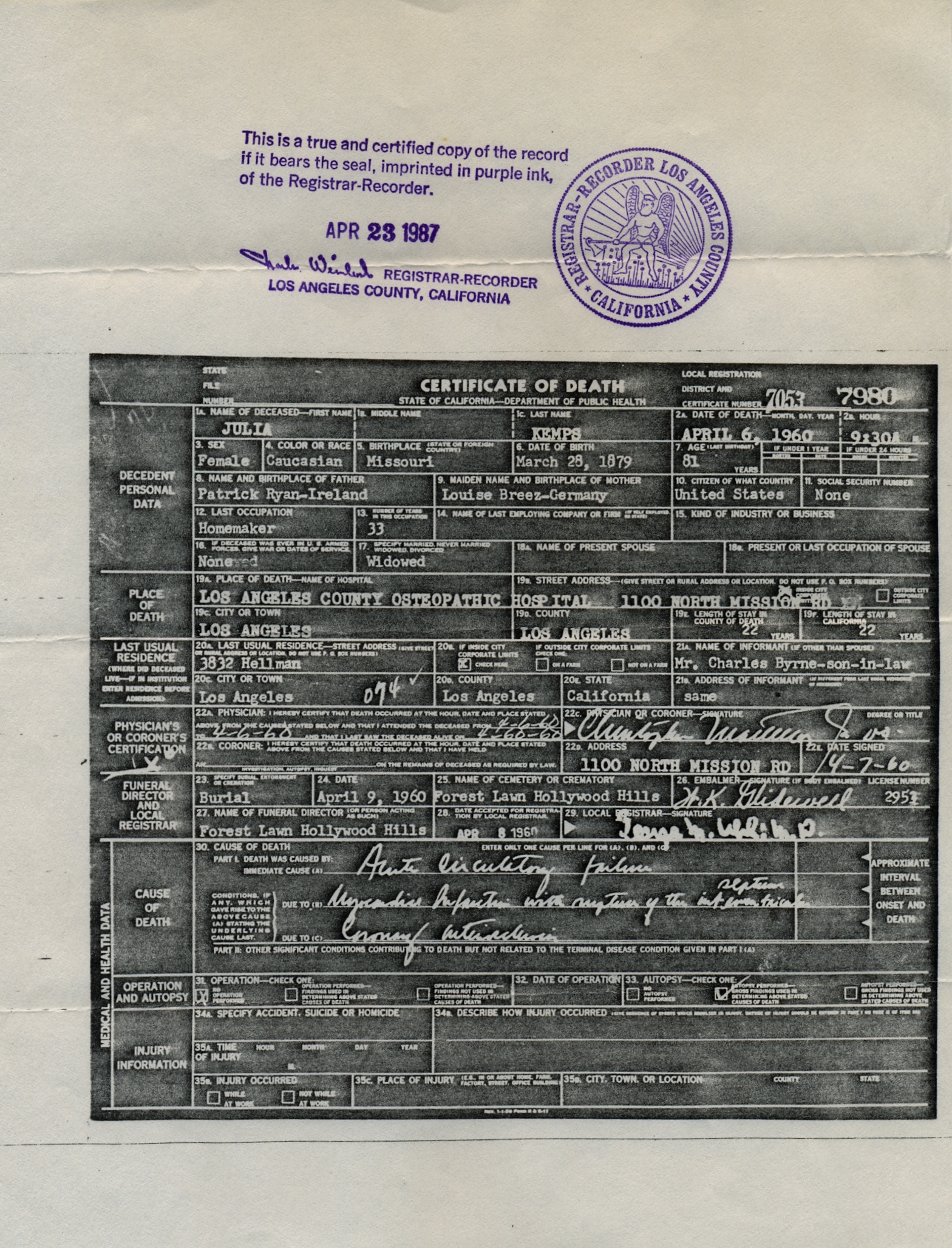 Julia Ryan Kemps died on April 6, 1960 in Los Angeles, California and is buried in Forest Lawn Hollywood Hills Cemetery. To see an image of the headstone, see this link.